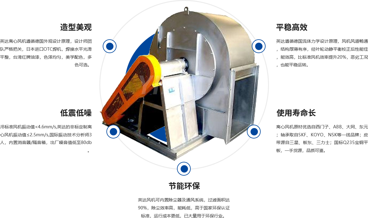 風(fēng)機(jī)葉輪、機(jī)殼可選用優(yōu)質(zhì)Q235碳鋼,304不銹鋼,玻璃鋼纖維,全部模具化生產(chǎn),采用電焊、手段,表面清潔平整、不存在焊接變形現(xiàn)象,葉輪經(jīng)動(dòng)、靜平衡校正,其平衡精度不大于4.0級(jí)。