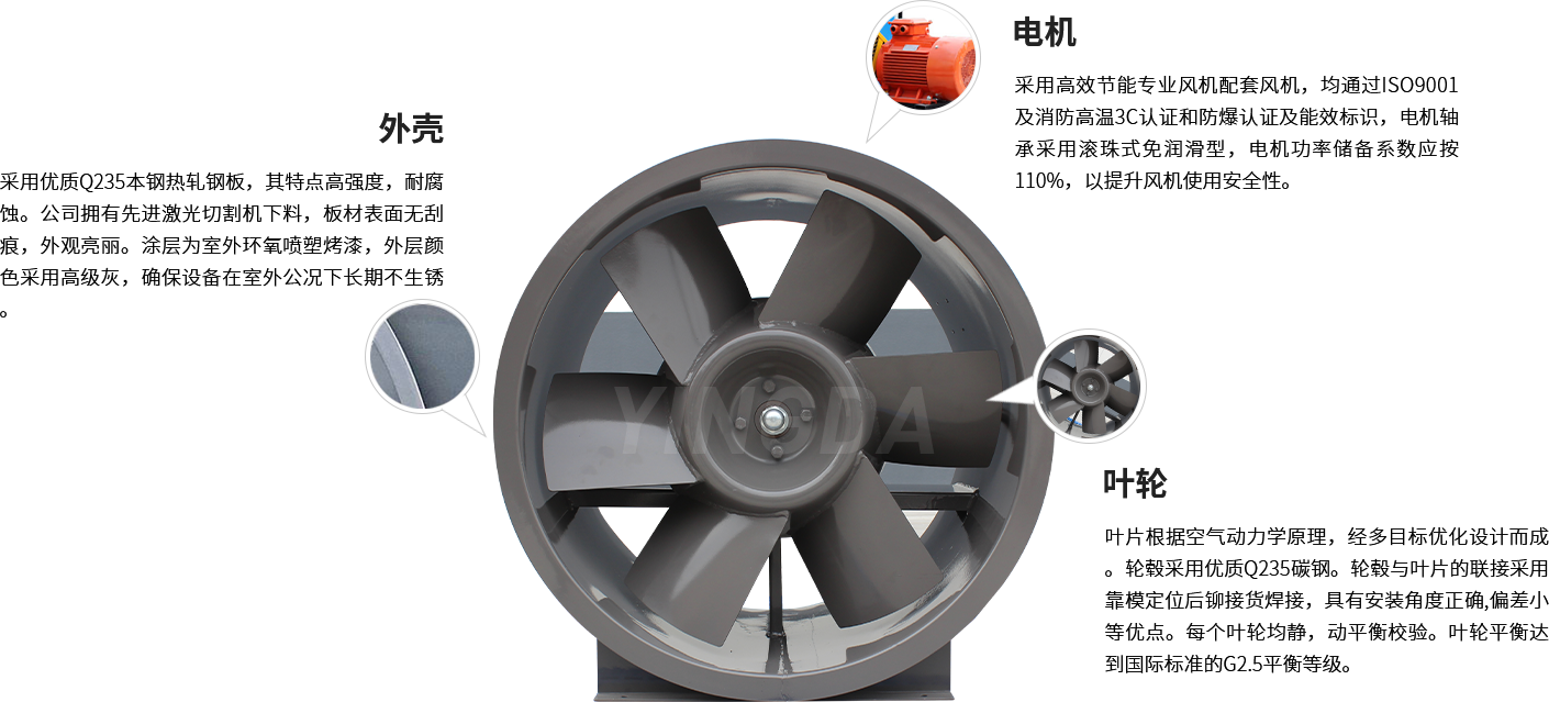 英達風機采用生產電機生產設備和檢查手續齊全的風機專用配套電機,均通過ISO9001及消防高溫3C認證和防爆認證及能效標識。電機應與風機負載緊密配合,采用B3安裝結構。電機防護等級為IP54,絕緣等級F級,溫升等級B級。電機軸承應為滾珠式免潤滑型。電機功率儲備系數應按110%取,以提升風機使用的安全性。