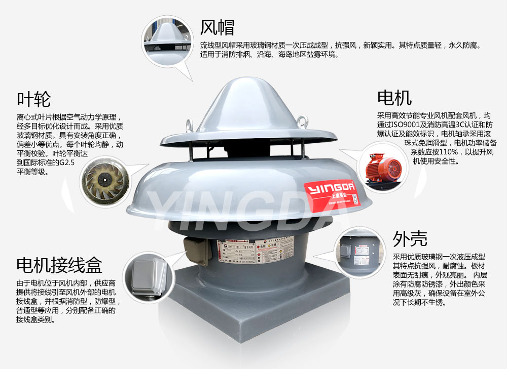 1.1.DWT-II型玻璃鋼離心式屋頂風機,其葉輪采用離心式葉輪,可適用風量小而壓力較高的場所;采用單層風帽。