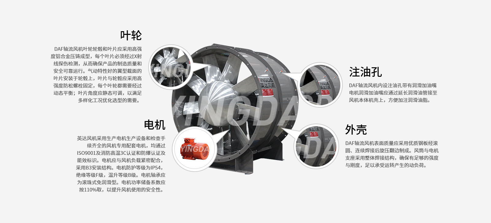 英達風機采用生產電機生產設備和檢查手續齊全的風機專用配套電機,均通過ISO9001及消防高溫3C認證和防爆認證及能效標識。電機應與風機負載緊密配合,采用B3安裝結構。電機防護等級為IP54,絕緣等級F級,溫升等級B級。電機軸承應為滾珠式免潤滑型。電機功率儲備系數應按110%取,以提升風機使用的安全性。